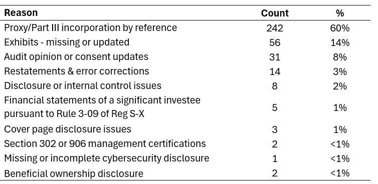 In this quarterly update, I examine the reasons for the 10-K/A amendments filed between April 1, 2025, and June 30, 2025. (Quarterly update # 6 is available here.)