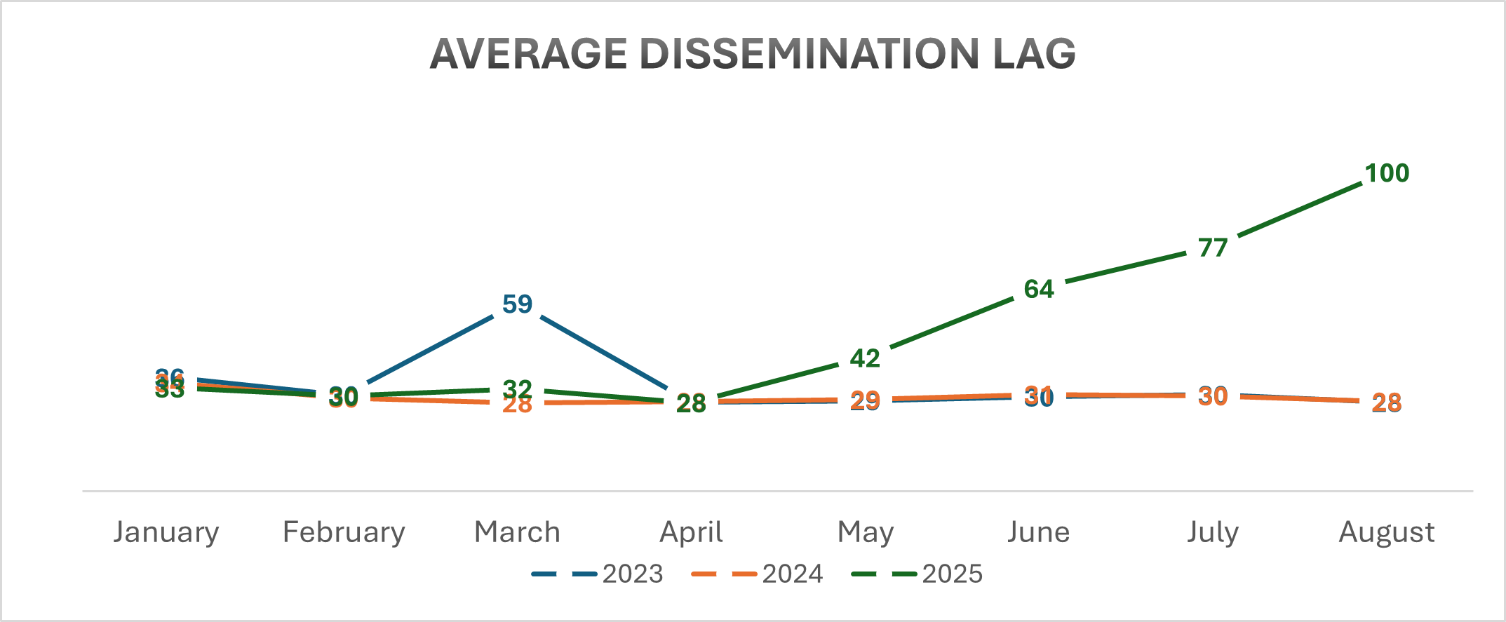 The chart below reflects the average dissemination lag of the closing letters publicly released on EDGAR between January and August of 2023, 2024, and 2025.