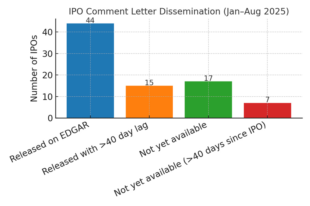 I obtained a sample of 61 IPOs filed between January and August 2025 using an S-1 prospectus. For 44 of those IPOs, the comment letters were already available on EDGAR, and for 15 of them – or about 30% - the comment letters were released with a dissemination lag of more than 40 days. Of the 17 IPOs for which comment letters are not yet available, in 7 instances – or approximately 40% - the IPO date was more than 40 days ago, suggesting that these comment letters are likely to be released late. Overall, at least 36% of the S-1 comment letter threads (22 out of 61) for the January – August 2025 IPOs are likely to be released late.