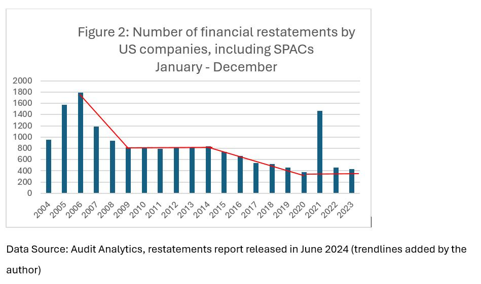 Note: the chart does not include the 2024 data because this data is not available in the Audit Analytics restatements report released in June 2024.