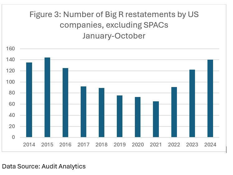 Stephen Foley of the FT wrote on December 9, 2024, that public companies are correcting their financial statements in “record numbers”. Importantly, according to data from Ideagen Audit Analytics cited by FT, not only the total number of restatements is up 7% year-over-year but the number of Big R restatements – material restatements that undermine reliance on previously filed financial statements – is at 9-year high.